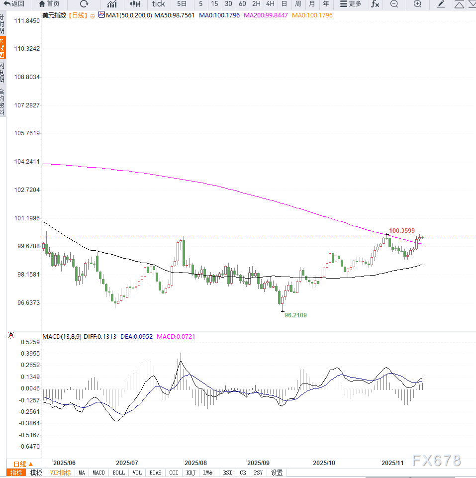 从日线级别观察,美元指数当前维持在100.00—100.60区间的弱势整理结构。短周期均线呈现轻微下倾,显示上行动能不足;而多次尝试突破100.60均未成功,反映上方抛压仍然显著。
