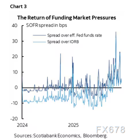 流动性与储备改善,对风险资产是重大利好,也能改善货币政策传导(钱市场利率与有效联邦基金利率之间的波动压力会减轻,图3)。