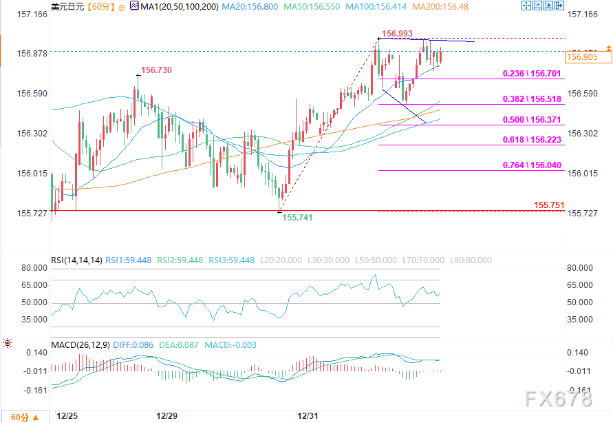 汇率曾短暂回落至156.70下方,下探至自155.74低点至156.99高点上行波段的23.6%斐波那契回撤位,但随即企稳回升,形成看涨旗形形态,形态阻力位位于156.80。